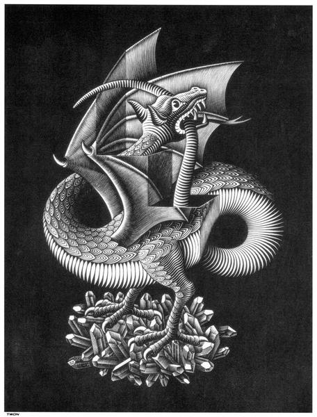 这幅《龙》可以说完全就是哥德尔第二定理的视觉化表达:作为一条处于二维的龙,它一直试图从一个面穿出,但是不管它如何努力,仍都永远在这个二维的系统内。超越系统也许是永远也无法做到的事情。